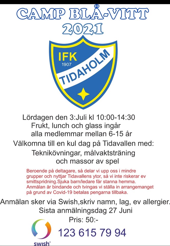Lördag 3 juli kommer vårat populära Camp blåvitt gå av stapeln. En heldag i fotbollen och kamratskapens tecken. Nytt för i år är att vi har bjudit hem nåra av föreningens största spelare att hjälpa till. Responsen har varit fantastisk och vi ser fram emot många kära återseenden. Vi kan även meddela att Tidaholmspodden kommer finnas på plats för inspelning. Riktigt kul. Med detta sagt önskar vi alla kamrater välkomna till en härlig dag.