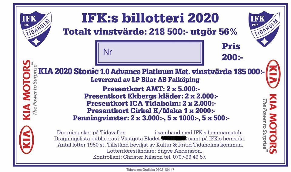 IFK har sedan tidigare beslutat flytta dragning i bil-lotteri till 5:e september. Detta pga. pågående pandemi. Vi tänker oss också lite annorlunda distribution för att undvika ev smittspridning. Tidigare lottköpare kommer att få ett SMS eller telefonsamtal från säljare och kan sedan swisha eller betala via bankgiro för deltagande i lotteriet. Då lotteriet är ett listlotteri behövs ingen fysisk lottsedel ( förvaras på T-vallen) Viktigt ange namn vid betalning även lottnummer om ni kan det. Nya lottköpare kontaktar i första hand kansliet eller någon ledare i IFK. Har du undringar eller frågor , kontakta IFK’s kansli - 0502 – 10044 Swish - 123 655 45 54 Bankgiro 688 – 5032 Vänliga hälsningar IFK’s billotteri kommitte Styrelsen