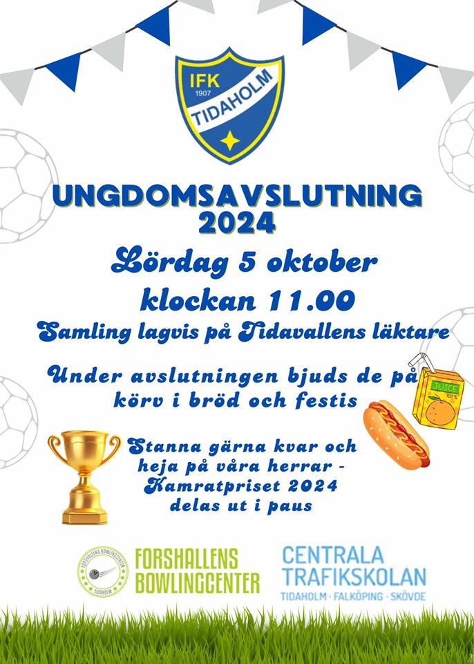 Välkomna till ungdomsavslutningen för 2024. Avslutningen äger rum den 5 oktober med start kl 11.00. Vi samlas då lagvis på tidavallens läktare. Under dagen kommer även årets Kamratpris delas ut. Välkomna