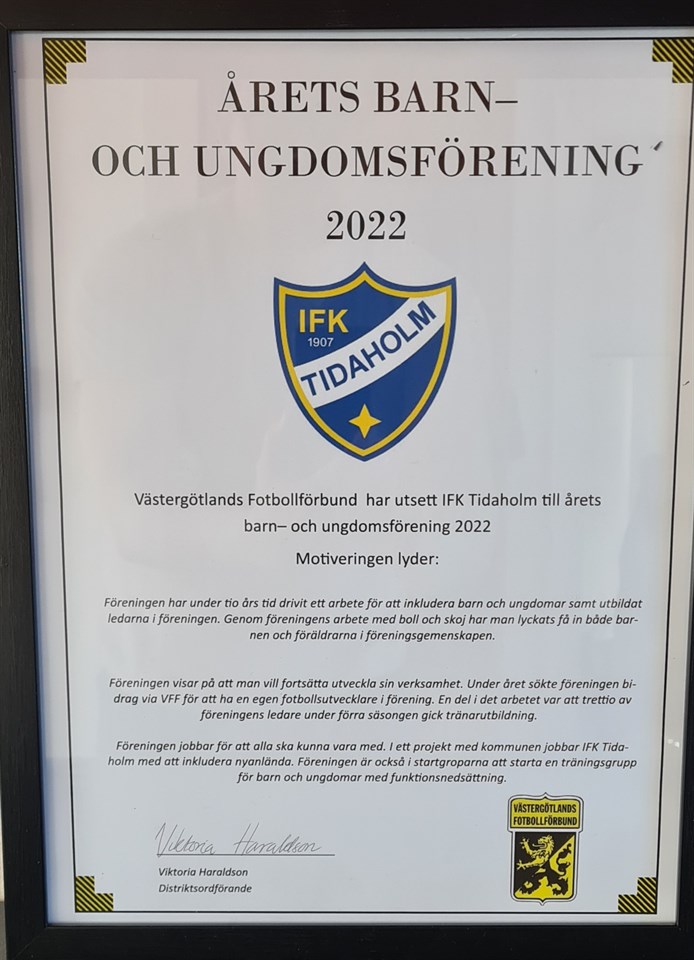 Västergötlands Fotbollförbund har utsett IFK Tidaholm till årets barn-och ungdomsförening 2022. Motiveringen lyder: Föreningen har under tio års tid drivet ett arbete för att inkludera barn och ungdomar samt utbildat ledarna i föreningen. Genom föreningens arbete med boll och skoj har man lyckats få in både barnen och föräldrarna i föreningsgemenskapen. Föreningen visar på att man vill fortsätta utveckla sin verksamhet. Under året sökte föreningen bidrag via VFF för att ha en egen fotbollsutvecklare i förening. En del i det arbetet var att trettio av föreningens ledare under förra säsongen gick tränarutbildning. Föreningen jobbar för att alla ska kunna vara med. I ett projekt med kommunen jobbar IFK Tidaholm med att inkludera nyanlända. Föreningen är också i startgroparna att starta igång en träningsgrupp för barn och ungdomar med funktionsnedsättning. Diplomet delas ut i samband med förbundets årsmöte. Västergötlands Fotbollförbund önskar stort grattis till IFK Tidaholm